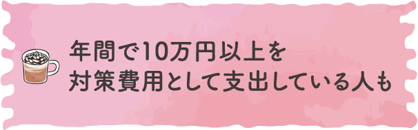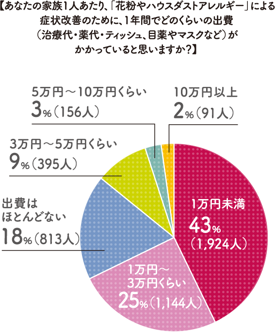 花粉やハウスダストによるアレルギー症状が出ると、ティッシュの消費量が凄まじく増えますし、治療代・薬代、さらには目薬やマスクなども必要になり、出費がかさみます。対策のための年間出費金額(家族1人あたり)を聞いたところ、上記の結果に。症状がひどい人は治療代・薬代だけでなく、高品質のマスクや特殊な掃除用品など、費用が増える傾向にあるようです。