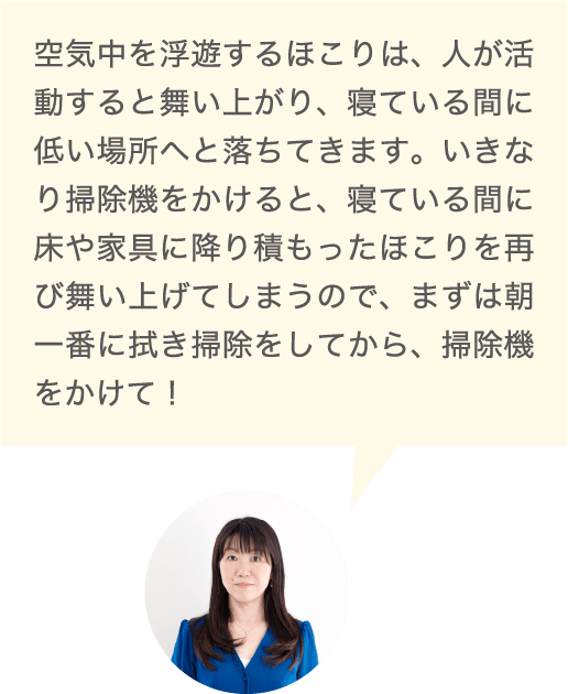 ハウスダストアレルギーを防ぐには、ダニやカビの温床となるほこりをためないのが一番。毎日のお掃除を徹底しましょう。湿度や温度の高い季節は、繁殖予防のための除菌も有効です。ほこりを除去した後、特にダニの発生しやすい畳、カーペットはアルコール水で拭き掃除をするといいでしょう。