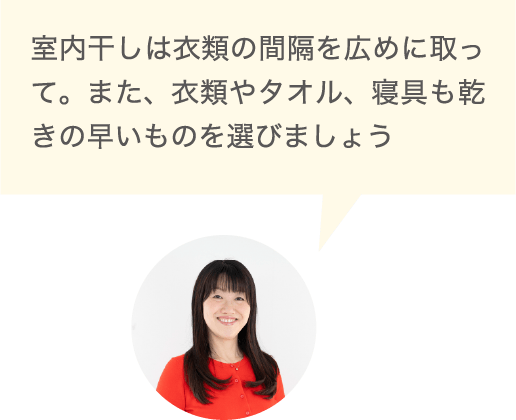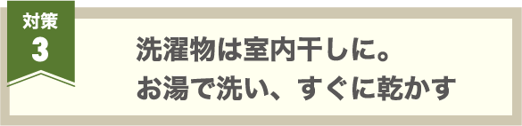 洗濯物を外干しすると花粉が付いてしまうので、花粉シーズンは室内干しにしましょう。また、カビ、ダニは「温度」「湿度」、そして栄養源となる「汚れ」がそろうと繁殖するので、汚れを落として素早く乾かし、湿った状態を長時間作らないことが対策となります。衣類の皮脂汚れをしっかり落とすには、洗濯にお湯を使い、脱水後はすぐに干すこと!洗濯槽を清潔に保つことも大切です。
