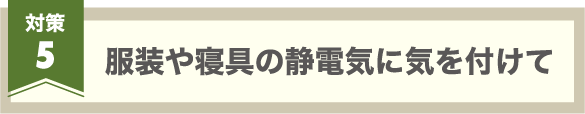 静電気の起きやすい衣類を着て外出すると、花粉を含むほこりを吸い寄せ、大量の花粉を浴びてしまいます。寝具も同様で、帯電しやすい繊維は、花粉やハウスダストを含むほこりが舞い落ちる際に吸い寄せてしまい、就寝中にほこりを吸う状況になってしまいます。花粉の季節は、静電気が発生しにくい綿や麻、絹の衣類、カビやダニの繁殖しやすい梅雨時季~秋は乾きやすい麻や絹の衣類がオススメです。