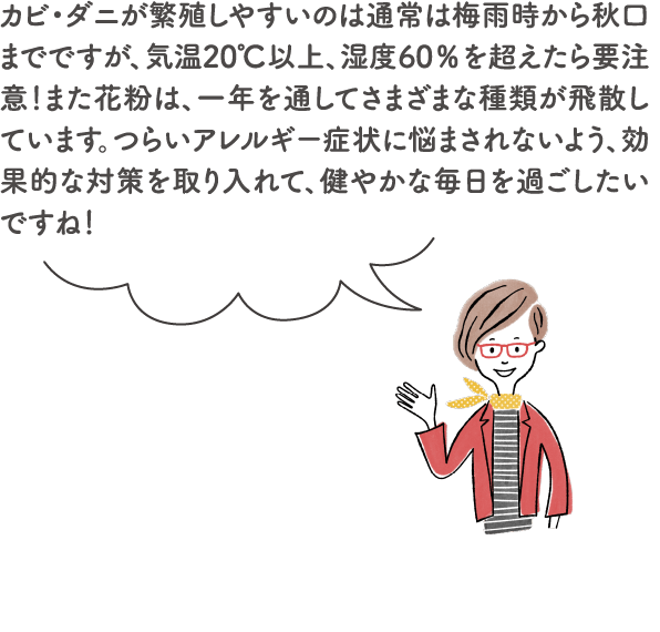 室内の空気中に花粉やハウスダストが浮遊しているとアレルギーの原因になるので、まずはきれいな空気環境を保ちましょう。花粉の季節は花粉の飛散量が少ない夜間に2方向の窓を開けて通風する、あるいは換気扇を回しながら1か所の窓を開けて換気をします。時間はいずれも10分程度。花粉が飛散する日中は外気を入れず、空気清浄機などを使用するといいでしょう。また、ハウスダストの原因となるカビやダニは、1日4~5回窓を開けて通気を確保することで繁殖を予防できます。