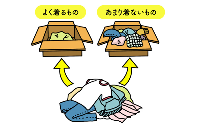 最初にダンボール箱を2つ用意し、「よく着るもの」と「あまり着ないもの」に分類します。