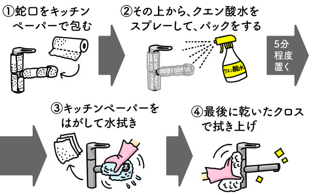 また、汚れが気になる際は、スプレーした部分をキッチンペーパーで包み、再度クエン酸水をスプレーし、クエン酸パックをします。5分程度置いたら、キッチンペーパーをはがして、水拭きをしましょう。最後に、乾いたクロスで拭き上げて完了です。