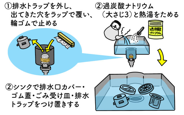 また、1週間に1回、除菌も行ないましょう。排水口カバー・ゴム蓋・ごみ受け皿・排水トラップを取り外し、出てきた穴をラップでふさぎ、輪ゴムで止めます。その後、排水口に過炭酸ナトリウムを大さじ3入れ、熱湯をためます。