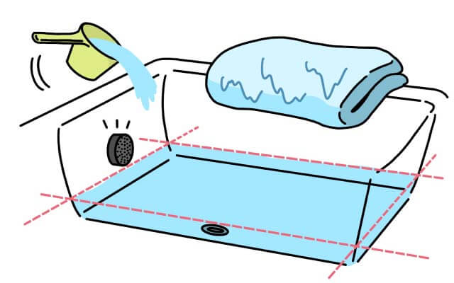 浴槽の縁に布団を掛けてから、浴槽にお湯を入れます。お湯は、循環口の下まで入れるようにしましょう。循環口の上までお湯を入れると、汚れた水や洗剤が風呂釜内に入ってしまい、汚れの原因にもなるため、注意してください。