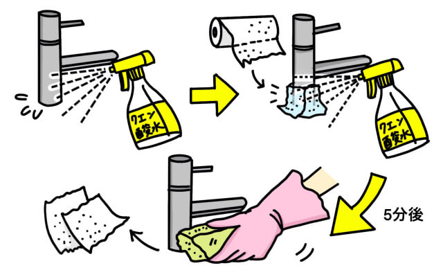 掃除手順は次の通りです。まず、蛇口の根元にクエン酸水スプレーを吹きかけます。その上からキッチンペーパーを巻きつけ、上からもう一度スプレーを吹きかけます。5分程度放置した後、キッチンペーパーを取り除き、スポンジでこすり洗いしましょう。こうすると、蛇口まわりの黒ずみを効果的に除去できます。