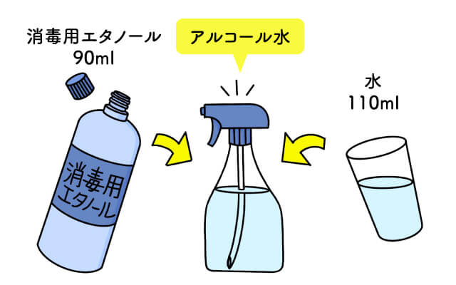 ニオイがない場合は、除菌効果の高いアルコール水を使用しましょう。アルコール対応のスプレーボトルに、水110mlを入れます。そして、消毒用エタノール90mlを加え、濃度35%にしたものを使います。基本的にアルコール水は3か月以内に使い切りましょう。