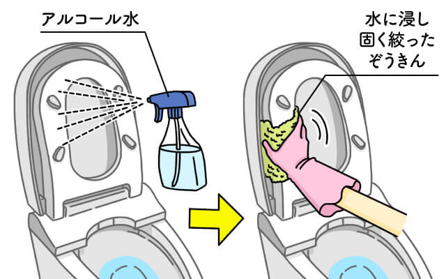 便座の裏側は便器内ではね返った汚れがたまりやすく、掃除を怠ると悪臭の原因となります。便座の裏側にアルコール水をスプレーしてから、水に浸し固く絞った雑巾や除菌クロスなどで汚れを拭き取りましょう。汚れが広がらないように、きれいな部分から拭いていくのがおすすめです。
