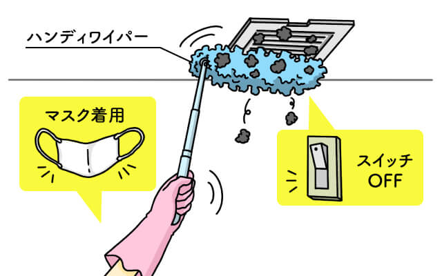 換気扇表面にほこりが付着している場合には、ハンディワイパーで換気扇表面を軽くなでるようにして拭き取ります。この際、換気扇の電源を必ず切り、ほこりやカビを吸い込まないようにマスクを装着しましょう。