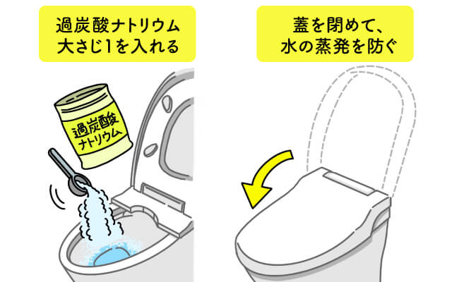 対策としては、なるべく流さない時間が長くならないよう心がけることや、使用後は蓋を閉め、水の蒸発を防ぐことが挙げられます。また、封水に大さじ1の過炭酸ナトリウムを入れておくと、雑菌の繁殖を防ぎニオイや汚れの予防になりますよ。