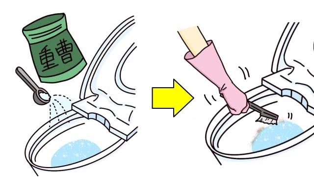 始めに、便器内に重曹の粉末をまき、ブラシを使ってこすり洗いします。汚れている場所に重曹の粉末を直接付けると、より効果的です。