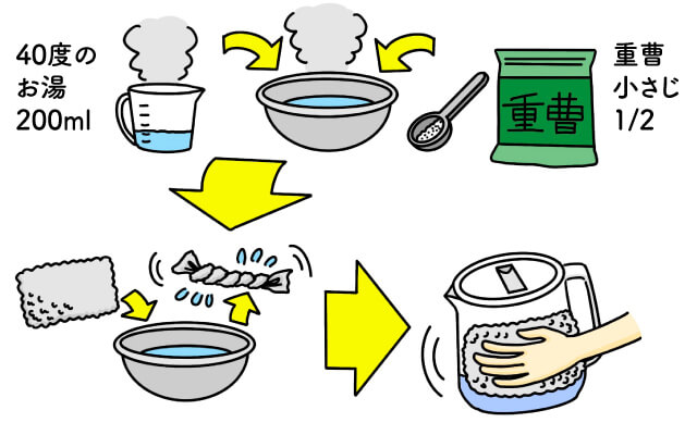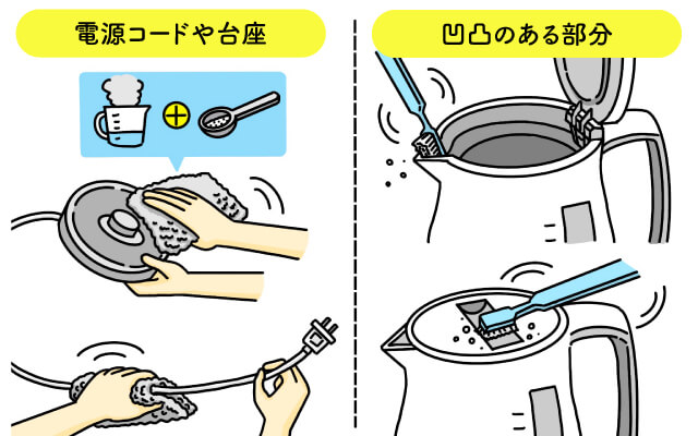 まず、40度のお湯1カップ(200ml)をボウルに入れ、重曹小さじ1/2杯を加えてかき混ぜ、重曹水を作ります。重曹水にふきんを浸して固く絞り、電気ケトルの外側を拭きましょう。