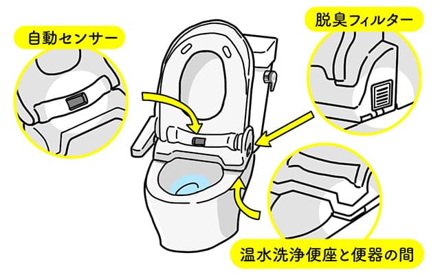 トイレのノズルや収納口以外にも、汚れがたまりやすい場所は意外と多くあります。ここでは、脱臭フィルターやセンサー、便器の間など、気になる部分を簡単に掃除する方法をご紹介します。