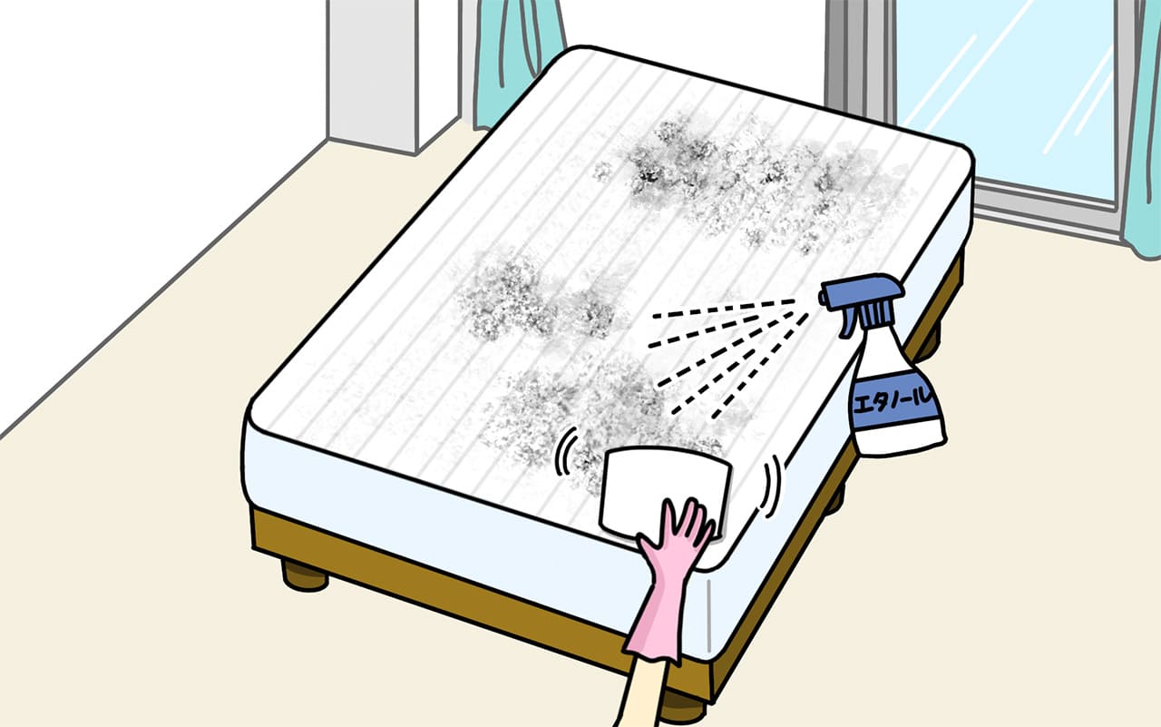 まず、消毒用エタノールを使用する前に窓を開けて換気をしましょう。その後、消毒用エタノールを染み込ませたキッチンペーパーで表面のカビを押さえるように拭き取ります。続いて、カビのある部分に消毒用エタノールをしっとりする程度にかけ、乾くまで30分程度おきます。絞ったタオルや雑巾など水気のあるもので拭き取ると、水分が残ってカビの原因を作ってしまうことがあるので注意しましょう。マットレスが完全に乾いたら、元に戻して布団を敷いたら完了です。