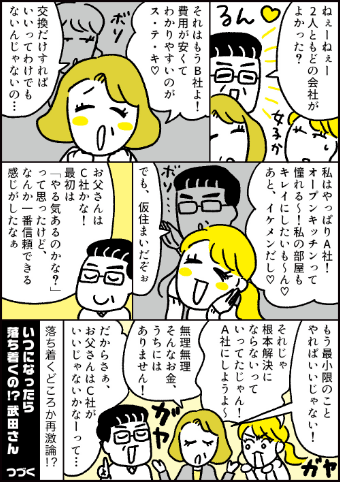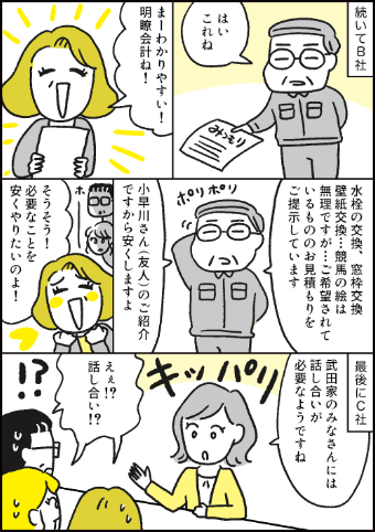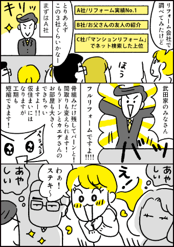 いやー何社か話を聞いたけど、同じリフォームでも会社によって提案が全然違うねー。特にC社の人は、武田家に寄り添ってくれる雰囲気があった気がするな。全員が納得するリフォームかー、ふむふむ。