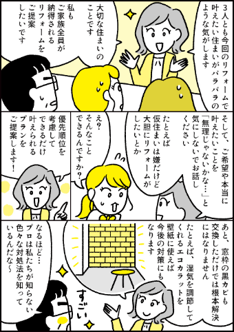 最初はリフォームなんて乗り気じゃなかったけど、話を聞いてみたら、私も夢が膨らんじゃった♡ほかの会社の提案も気になっちゃうな!