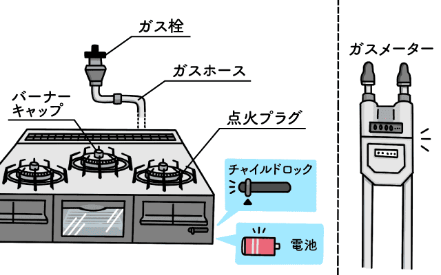 ガスコンロから「チチチ」と音が鳴っても火がつかない場合、その原因は電池切れではありません。また、火が付かないからといって、「チチチ」という音が鳴る状態を何度も繰り返すと、その間ずっとガスが出ている場合があるので、確認の際は注意しましょう。音が鳴っても火がつかないときには、以下の3つのポイントをまず確認します。