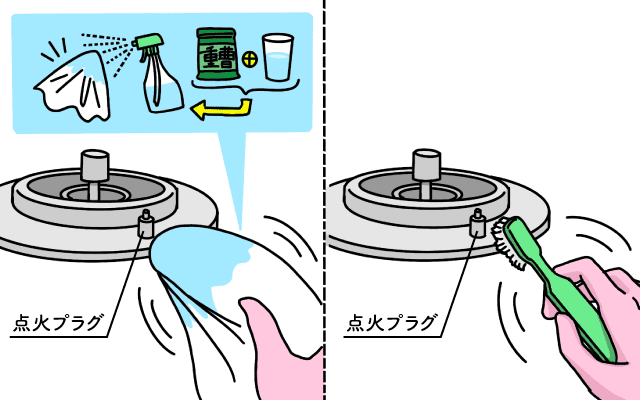 ガスコンロは、点火プラグから火花が出る仕組みです。そのため、点火プラグが汚れていると着火しにくくなります。汚れがたまらないように、こまめに掃除することをおすすめします。