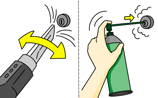 2つ目はエアダスターです。掃除機で鍵穴の異物を取るのが困難な場合は、パソコンのほこりやごみを除去するエアダスターが役立ちます。特に、缶タイプは噴射力が強く、鍵穴に向けてスプレーするだけで狭い隙間のほこりも吹き飛ばせるため便利です。