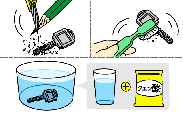 クエン酸やお酢はいずれも、鍵のサビを落とすのに有効です。クエン酸の場合、プラスチック容器などに鍵と水またはお湯を入れ、そこにクエン酸を溶かします。一晩そのまま浸けておけばサビがきれいに取れるでしょう。お酢を使う場合は、プラスチック容器に鍵を入れ、鍵が浸る量のお酢とその半量ほどの塩を加えて1時間放置しましょう。擦ったりしなくてもサビが浮いてきます。クエン酸やお酢はそもそも食用で、鍵にも手指にも影響がほとんどなく安心です。