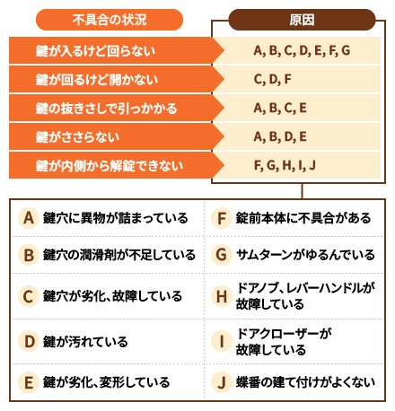 上記の表にある状況のなかでも「鍵穴の潤滑剤が不足している」「鍵穴が劣化、故障している」「鍵が劣化、変形している」「ドアクローザーが故障している」については、プロに任せましょう。このような場合、素人が対応するのは難しいので、無理にいじらないことが大切です。