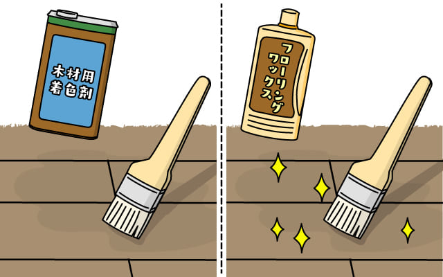 その後、木材用の着色塗料で周りと色を合わせ、フローリングワックスで仕上げると補修は完了です。