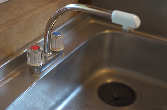 で水・お湯が出るもの(シングルレバー)、水・お湯のバルブに分かれているもの(2ハンドル)があります。