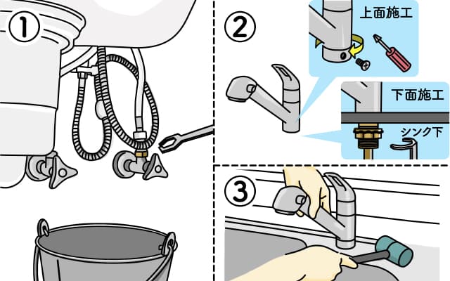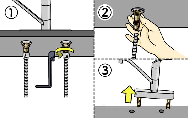 基本的な手順はワンホールタイプの水栓と同様ですが、給湯管・給水管と水栓をつなぐホースが水栓と一体化されていないため、取り外し・取り付けを行なう箇所が異なる点には注意しましょう。
