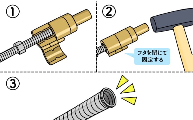 切断しただけではナットがはまらないため、ツバ出し器とハンマーを使ってネジ山を加工し、給水管・給湯管にナットで接続できるようにします。