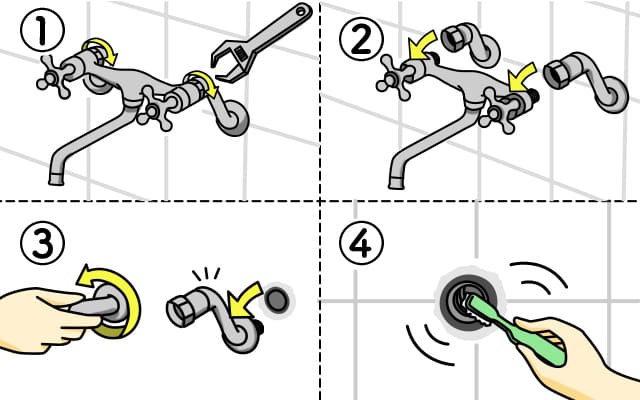 壁付きタイプはホール型とは異なり、モンキーレンチとシールテープがあれば交換が可能なため、作業自体は簡単です。ただし、壁の中の配管が経年劣化していると、交換作業中に取付脚(クランク)に強い力を加えると、配管が折れる場合があります。