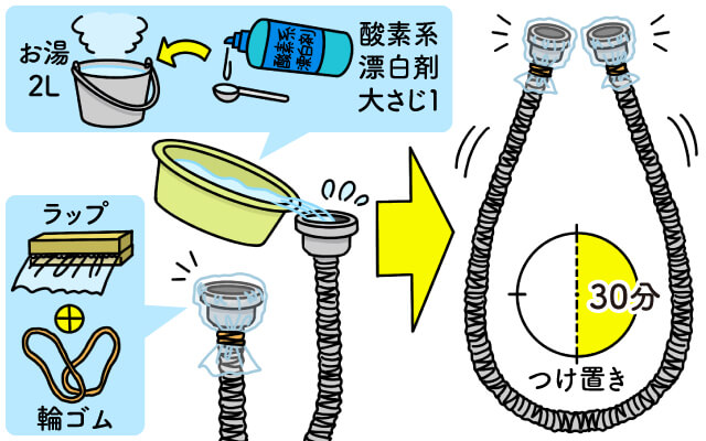 2Lのお湯に酵素系漂白剤を大さじ1溶かし入れ、ホースの中に流し込んで30分程度つけ置きします。その際、ホースから洗浄液が流れ出ないように、ラップと輪ゴムなどを使って口をふさぎます。
