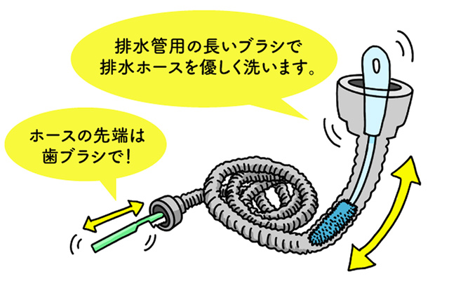 排水ホースの先端に付いた汚れは、歯ブラシなどでこすると落とせます。排水ホース内の汚れは、排水管用の細長いブラシを使って落とすとよいでしょう。