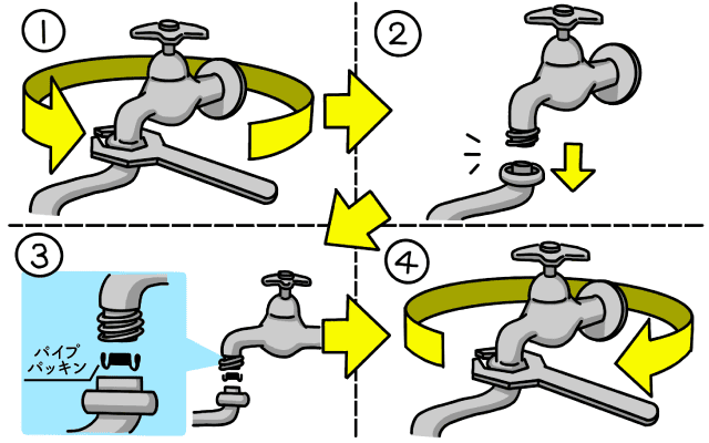 吐水口(パイプの先)から水がポタポタと漏れる場合は、コマパッキン(ケレップ)を交換します。手順は以下の通りです。