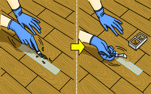 フローリングにもいくつか種類があり、素材ごとに適切な補修方法があります。天然木を切り出した一枚板の無垢材には専用のオイルを塗り、基板と表面材を合わせた複合(合板)フローリングには、主に接着剤やパテのような補修材を使います。