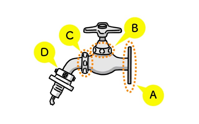• 蛇口とニップルの接続部分からの水漏れ(D部分)