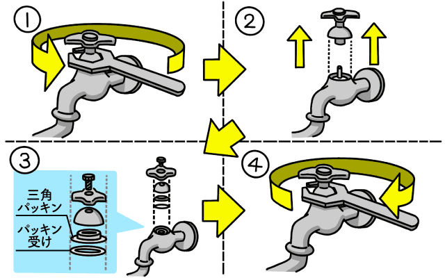 ここからは水漏れを発見したときに、自分で解消する方法を紹介します。以下4つの水漏れ箇所ごとに対処法を見ていきましょう。