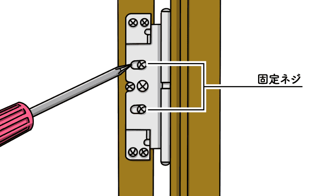 蝶番には「固定ネジ」や「調整ネジ」で、ドアの傾きを調整できるタイプがあります。調整ネジのある蝶番であれば、ドアを外さず、ネジを緩めたり締めたりすることで、傾きの調整が可能です。