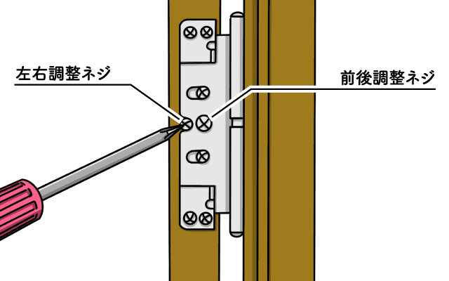 蝶番の調整ネジを回すと、左右・前後の位置を微調整できます。調整ネジを回す際は、半回転から1回転ずつ回しながら、ドアの位置をこまめに確認して調整しましょう。なお、蝶番のなかには調整ネジがないタイプもあるため、その場合の対処法は後ほど解説します。