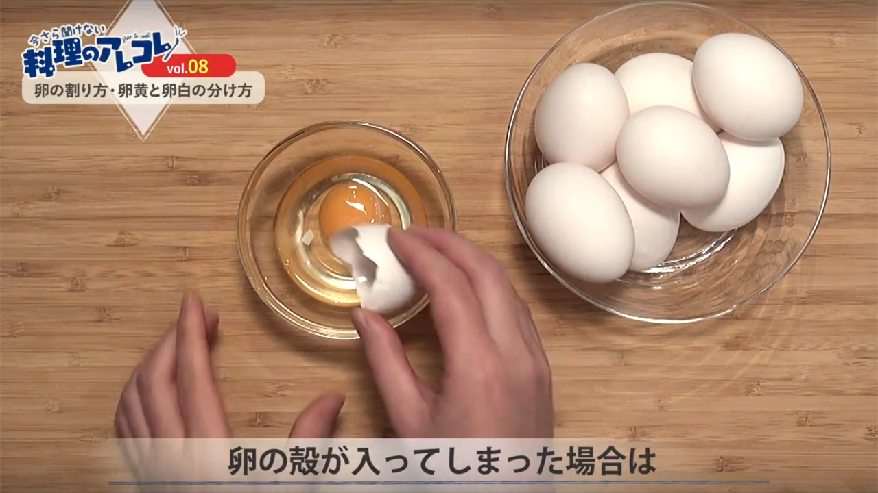 卵の殻が入ってしまった場合は、卵の殻でやさしくすくって取り除きます。殻を使うことで、破片との間に表面張力が生まれ効率的に取り除くことができます。