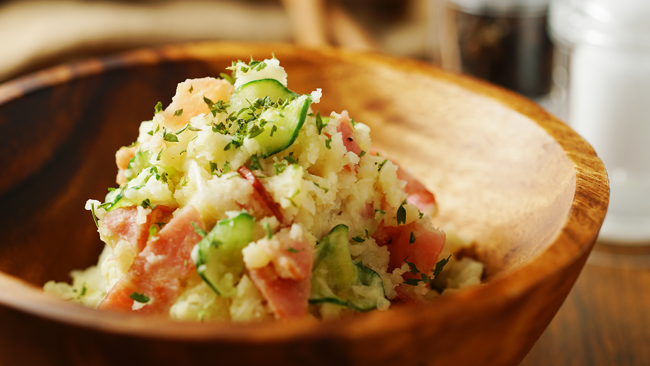 ゆでたじゃがいもをボウルに入れ、軽くつぶします。マヨネーズ、塩、粗びきこしょうで味付けすれば、シンプルなポテトサラダのできあがり。お好みでハムやきゅうり、にんじんを入れるのもおすすめです。お弁当や、もう一品おかずが欲しいときに最適なメニューですよ。
