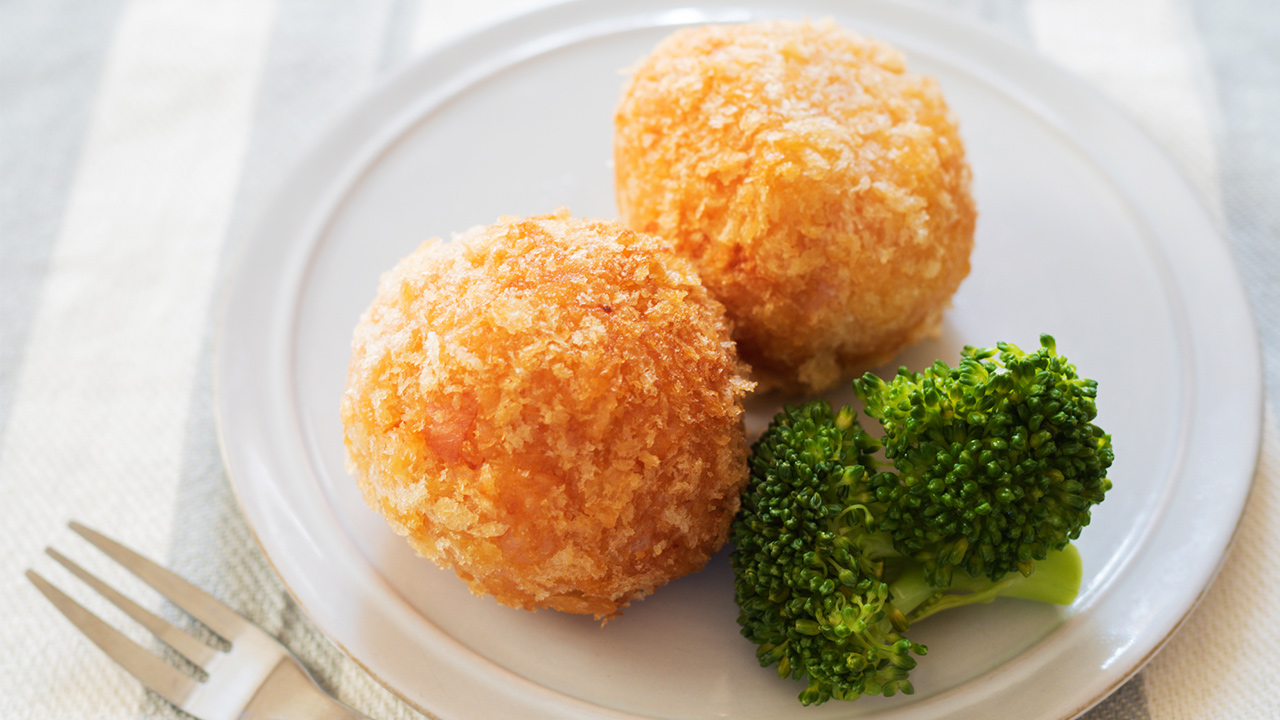 お弁当のおかずや、おつまみにぴったりなコロッケのレシピです。余ったルーに、グリンピースと温かいごはん、炒めた玉ねぎ、塩こしょうを混ぜ合わせましょう。全体が混ざったら、丸くまとめて小麦粉、溶き卵、パン粉を順に付けていきます。最後に、きつね色になるまで揚げてできあがりです。