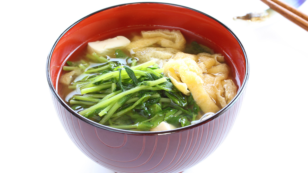 豆苗は食べやすいサイズに切ります。油揚げは油抜きして、短冊切りにしておきましょう。鍋にだし汁を沸かし、豆苗と油揚げを入れます。ひと煮立ちしたら火を止めて、味噌を溶き入れたらできあがりです。ボリュームアップに豆腐を入れるのもおすすめ!