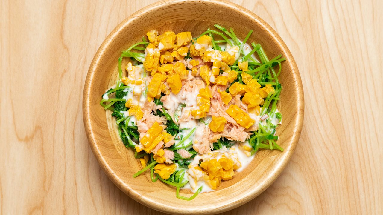 たとえば、豆苗に塩昆布、ゆずの皮を和えれば、爽やかな香りの和風サラダに。豆苗にツナやコーンを加えてマヨネーズで和えれば、子どもの食事にもぴったりなツナマヨサラダになりますよ。