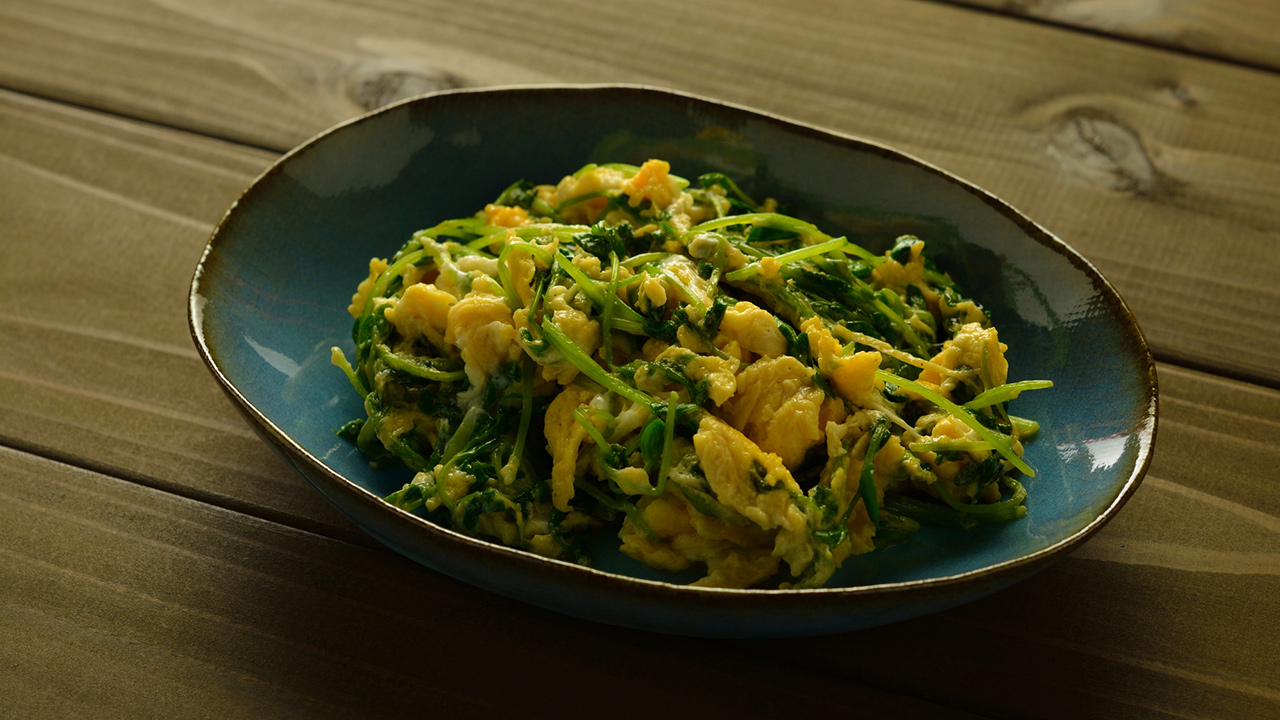 豆苗の卵とじは、だしの風味とふわふわ卵にほっと癒される一品です。