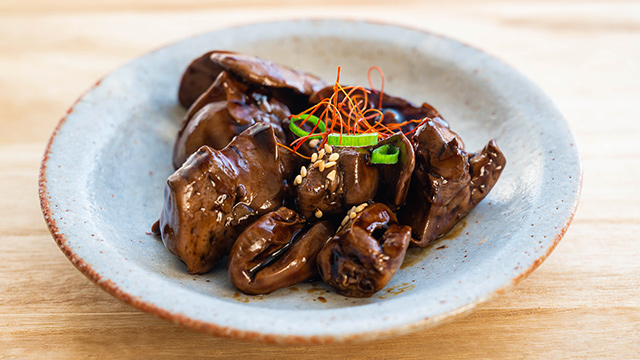 レバーの甘辛煮は、甘辛いたれでご飯が進む料理です。下処理した鶏レバーを食べやすい大きさに切り、フライパンに酒、みりん、醤油、砂糖、千切りの生姜を入れて煮込みます。アクを取り除き、水分がなくなるまで煮詰めます。器に移し、青ねぎ、赤唐辛子、胡麻を散らしたらできあがりです。