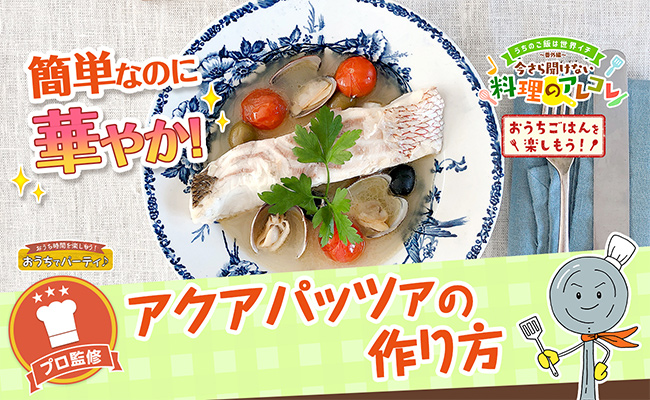 「うちのご飯は世界イチ」の番外編、お料理の基本をご紹介するミニレッスンへようこそ。第140回は、お料理オンラインイベントのメニュー「アクアパッツァの作り方」です。おうちでもバル気分を楽しめる、おしゃれなレシピを動画でご紹介します。