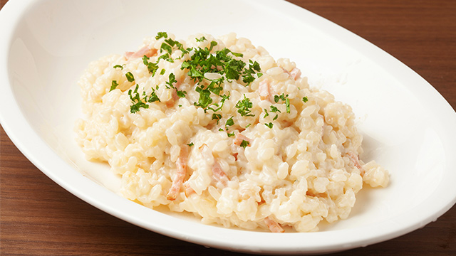 フライパンに米を洗わずに入れ、透明になるまで炒めます。フライパンに温めたスープを少しずつ入れ、スープがなくなるまで加熱してください。塩で味をととのえたら、お皿に盛り付けます。パルミジャーノチーズをかければ完成です!