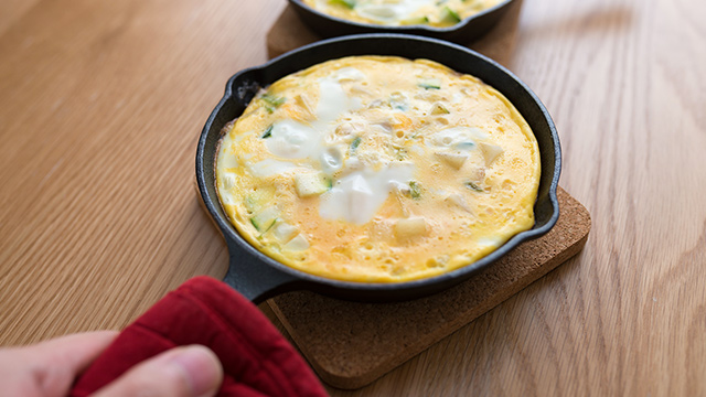 あらかじめ油をなじませたスキレットを温め、オリーブオイルを引き、具材を炒めます。野菜に火が通ったら溶き卵、チーズを加え、トースターやオーブンで焼きます。きれいな焦げ目がついたらパセリを振って完成です!
