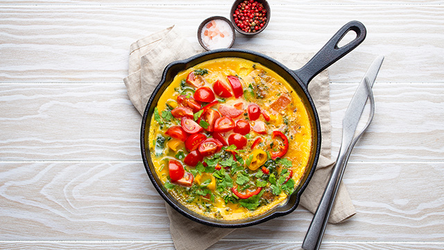 スパニッシュオムレツは、卵と具材を型に入れてオーブンで焼くスペインの家庭料理。フライパンでも作れるので、忙しい朝のごはんにもお弁当のおかずにもおすすめです。
