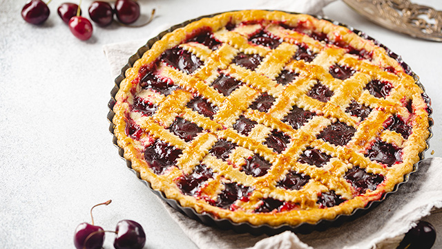 市販のパイシートを細長く切り、格子模様を作っておきます。もう1枚のパイシートを麺棒でのばし、型に隙間なく敷きます。中にアメリカンチェリーのコンポートを入れ、格子模様にしたパイシートを上にのせて卵液を塗ります。予熱したオーブンでこんがり焼き上げればできあがりです。